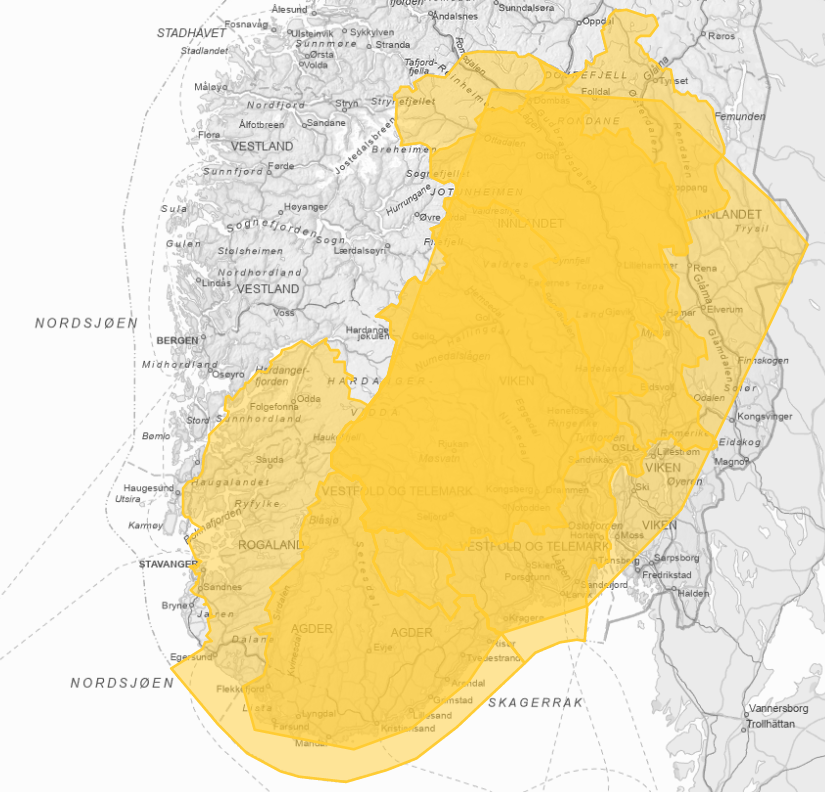 ኣብ ምዕራባዊ ኖርወይ ካብ ሃርዳንገርፍዮርድን ኣግደርን ንደቡብ ብጫ መጠንቀቕታ ውሕጅ ኣሎ።